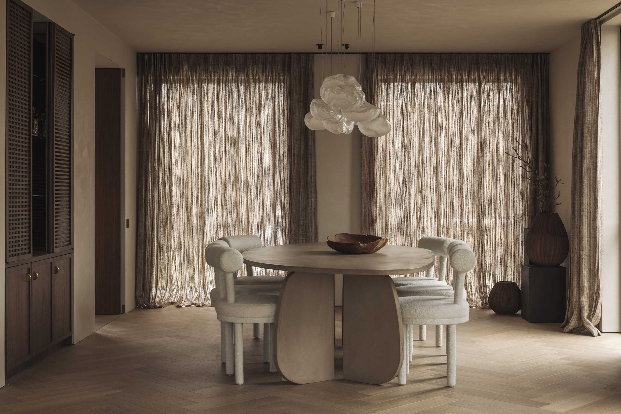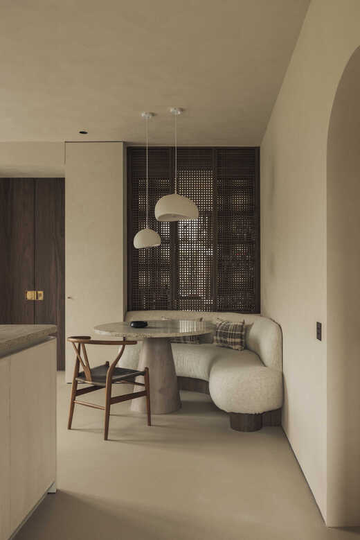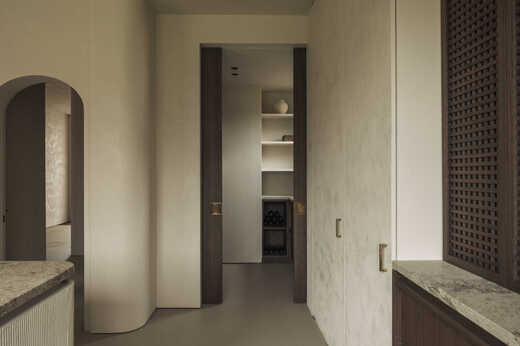 De keuken vormt het centrale hart van de woning en combineert maatwerk in Amerikaanse notelaar met een werkblad in Astoria White Leatherlook. Het kookeiland, afgewerkt met een subtiele textuur, sluit naadloos aan bij de wanden en fronten en vormt een echte blikvanger. Verticale houten latten, discrete grepen en een pivotdeur naar de leefruimte versterken de strakke belijning. Ook de ingebouwde koffiehoek en de bijkeuken in dezelfde materialen en kleuren dragen bij aan de harmonie. De op maat gemaakte zitbank met ronde rugleuning toont de kracht van ons eigen atelier, waarin comfort en esthetiek perfect samenkomen.