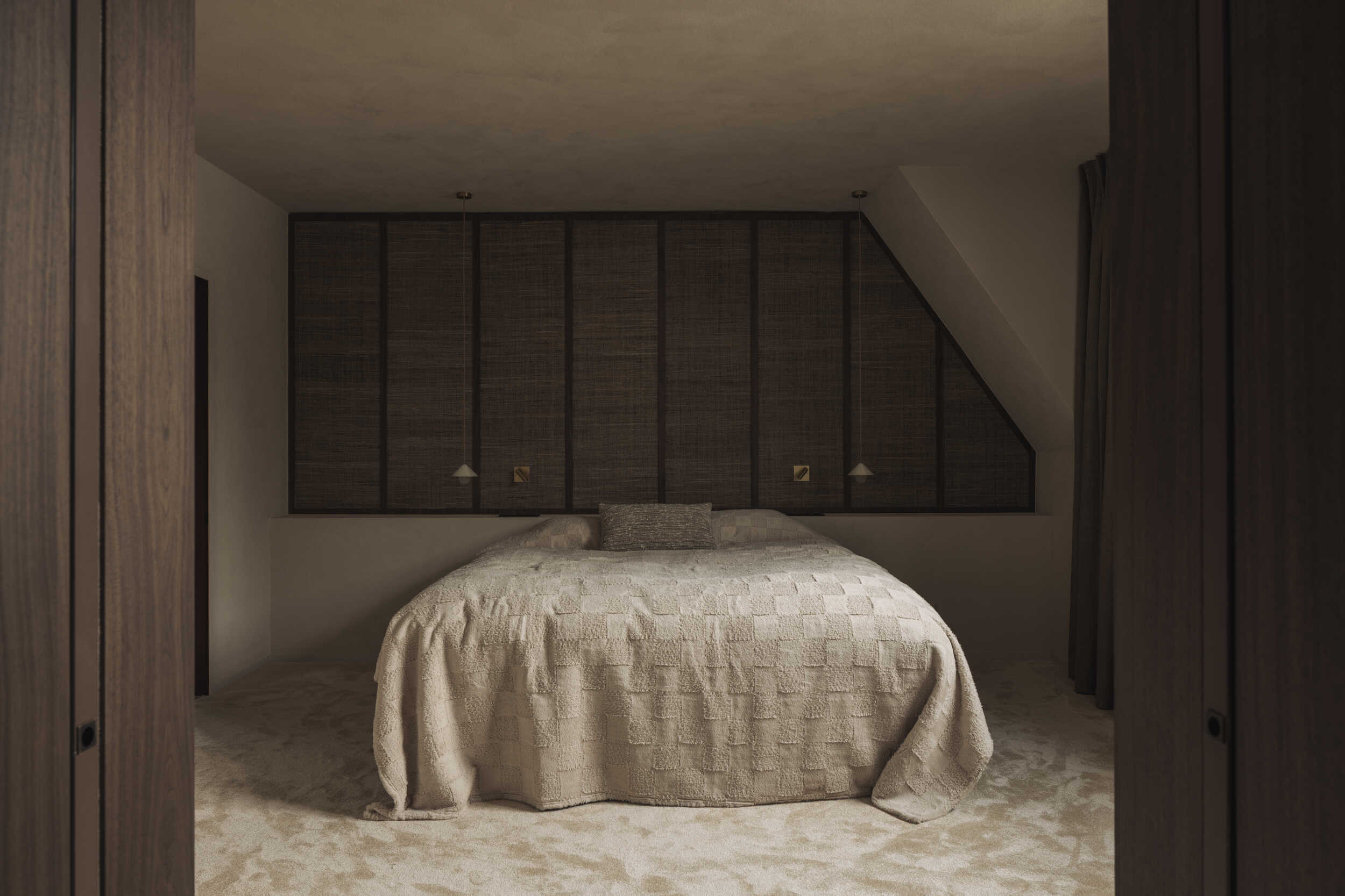 De dressing werd uitgewerkt in dezelfde verfijnde houtafwerking, aangevuld met subtiele messing grepen die elegantie toevoegen. In de master suite zorgen een exclusieve wandbekleding in bananenblad en zachte tinten voor een luxueuze sfeer. De kinderslaapkamers kregen elk hun eigen identiteit, met verfijnde wandpanelen en frisse kleuren. De badkamers stralen tijdloze luxe uit: in de masterbadkamer loopt een werkblad en spatwand in Breccia Rose Leatherlook natuursteen elegant door tot bij het bad, terwijl de kinderbadkamer speelse groentinten en keramische tegels combineert tot een evenwichtige en comfortabele ruimte.