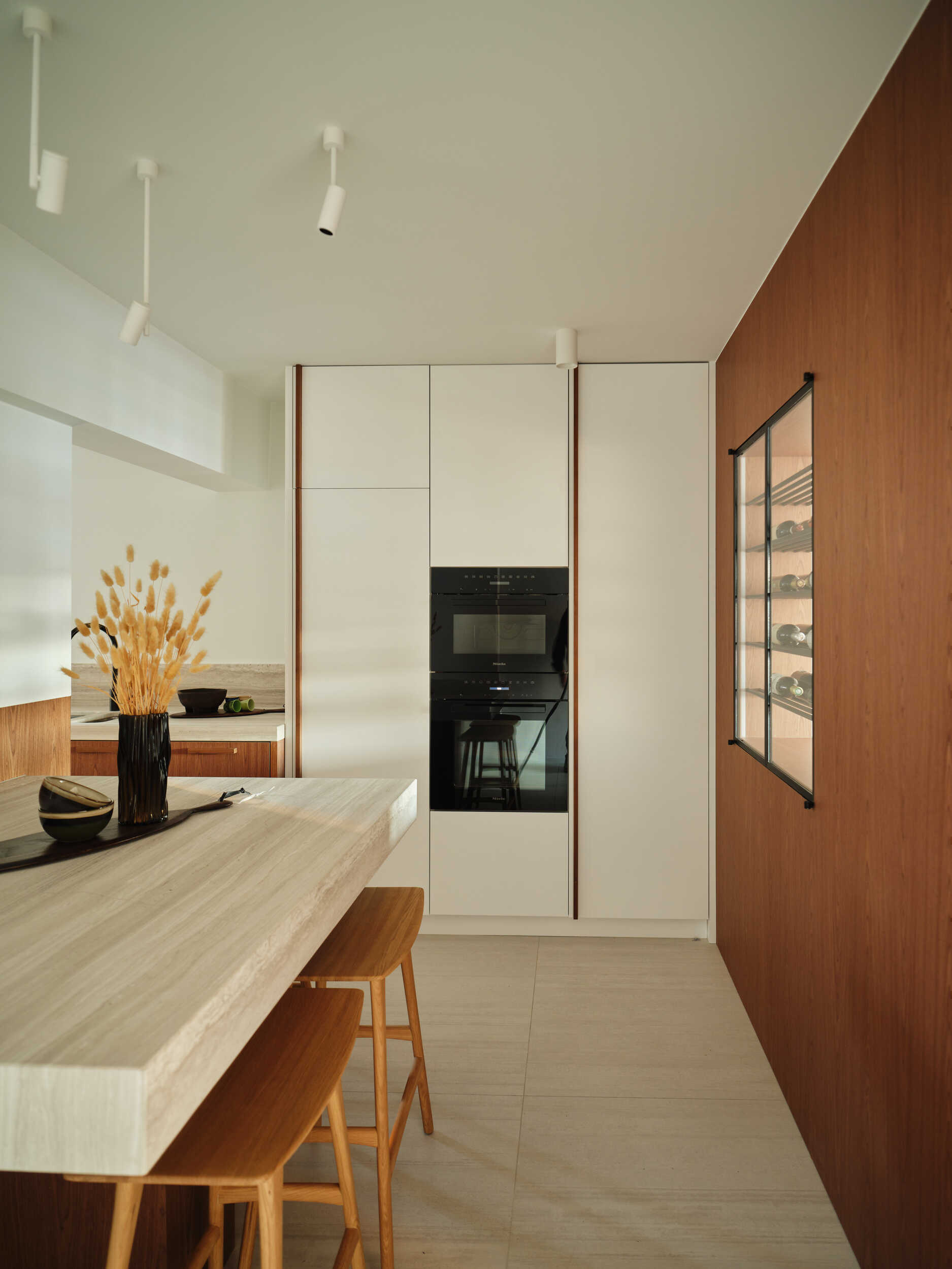De keuken vormt het hart van het appartement en werd uitgewerkt in een combinatie van fijn notelaarfineer en zachte groentinten. Het royale kookeiland in natuursteen Oak Grey trekt meteen de aandacht met zijn massieve uitstraling en uitgewerkte verstekdetails. Alle toestellen zijn discreet geïntegreerd, waardoor een strakke en functionele eenheid ontstaat. Het maatwerk zet zich verder in de zitbank en de bijhorende kasten, telkens met dezelfde verfijnde houtafwerking.